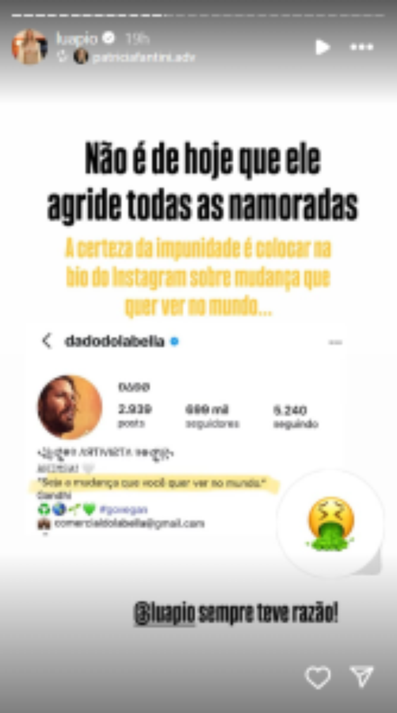 Luana also reiterated that she had already warned about her ex’s behavior: “I’ve always been right” and “I told you so,” read one of the posts shared. In another, he highlighted the context of privilege: “This is the definition of the privilege of white, cis, straight men. After the violence against Luana Piovani he entered a reality show and came out the winner.”