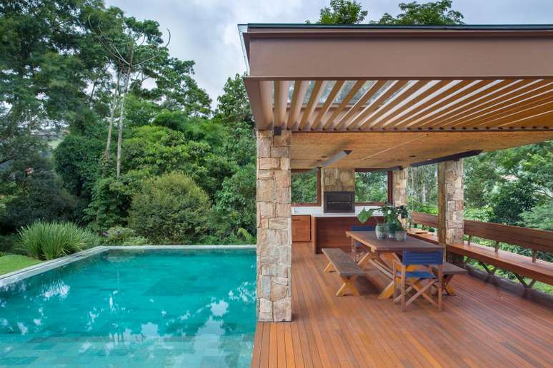Upon completion of the renovation, the house now measures 440 m2, with five suites, a living room with television and wood-fired pizza oven, a balcony that serves as a second open living room and a pool area with barbecue and sauna.