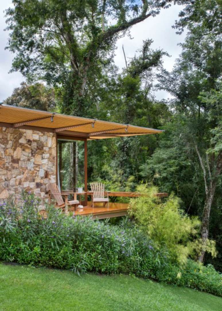 The social area, consisting of a living room and dining room with internal pizza oven, balcony and kitchen, is connected to the sleeping area via a internal hall with a small scale that follows the topography of the land. The couple’s suite was designed as a bungalow which seems suspended, disconnected from the house.