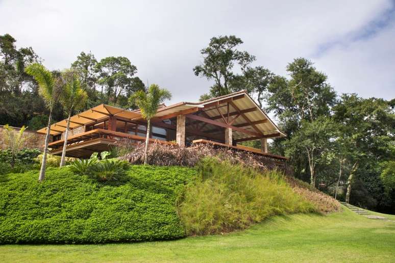 According to the duo, the idea of ​​the project was keep the main body of the original house as the central axis expand the built area both laterally (through preformed slabs with eaves made with metal arms, glass and wooden rulers) and frontally (through the expansion of the original roof, which contributed to creating the new design of the main facade).