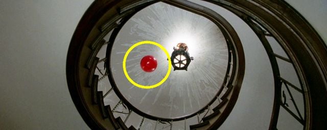 Obviously, given that Malcolm is also one of the ghosts, the sequence he’s involved in also contains (at least most of the time), an element of red. When she “dines” alone in a restaurant with her husband, the latter wears a red dress. When she gives the book to her new boyfriend (much to Malcolm’s chagrin), the wrapping paper is bright red. As for the handle of the cellar in which the main character keeps notes, it is also red.