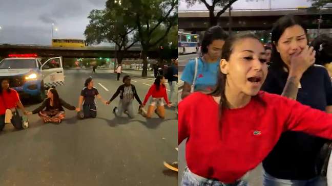 BY PARTICIPATING  Relatives of the victims of the operation kneel in an avenue to ask for the bodies to be released in Rio